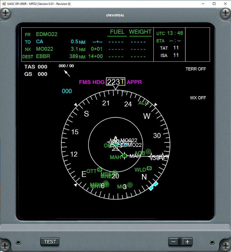 An external simulated Weather Radar (WXR) computer can be interface with the Universal Avionics simulation solution. The MFD can be selected to show the WXR data, corresponding to the actual simulated weather in X-Plane. The WXR tilt and gain can be set from the Universal Avionics control panel. Also a WXR test pattern is available.