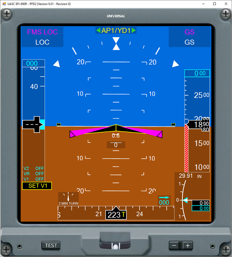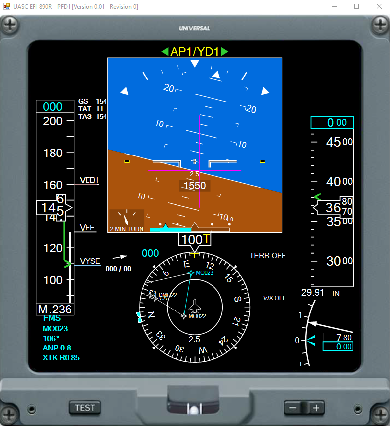 We simulate the EFI-890R Advanced Flight Display which is the (co-)pilot’s main view on the status of aircraft and systems. We implement the Primary Flight Display (PFD) in both normal as well as composite view mode, the Multifunctional Flight Display (MFD) in both Naviagation/Map as well as in HSI view, and the Engine Indicating and Crew Alerting System (EICAS).