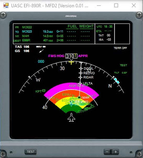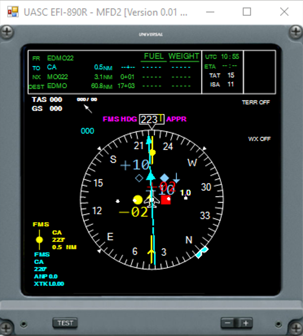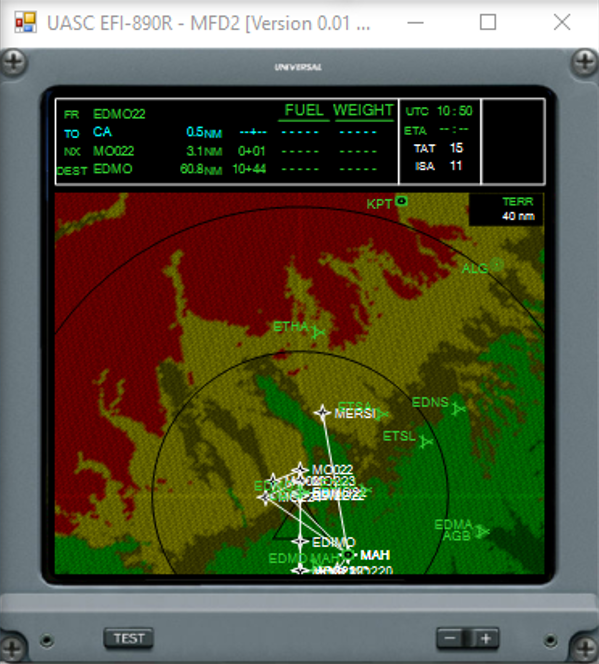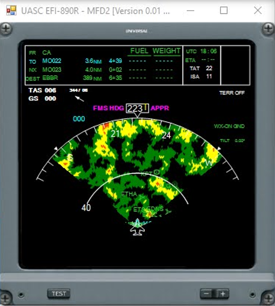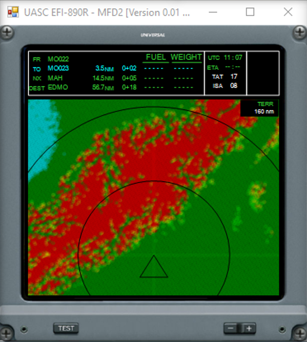 An external simulated Weather Radar (WXR) computer can be interface with the Universal Avionics simulation solution. The MFD can be selected to show the WXR data, corresponding to the actual simulated weather in X-Plane. The WXR tilt and gain can be set from the Universal Avionics control panel. Also a WXR test pattern is available.