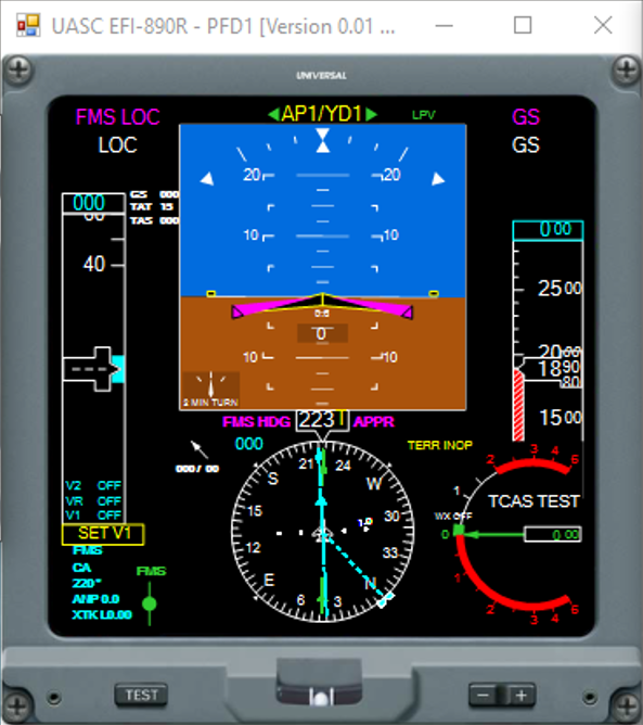 An external simulated Traffic Collision Avoidance System (TCAS) computer can be interfaced with the Universal Avionics simulation solution. The PFD shows Resolution Advisory (RA) commands on the vertical speed indicator. The MFD shows the position of intruder traffic on the map. Also TCAS test pattern is available. The TCAS config can be controlled from the RCU.